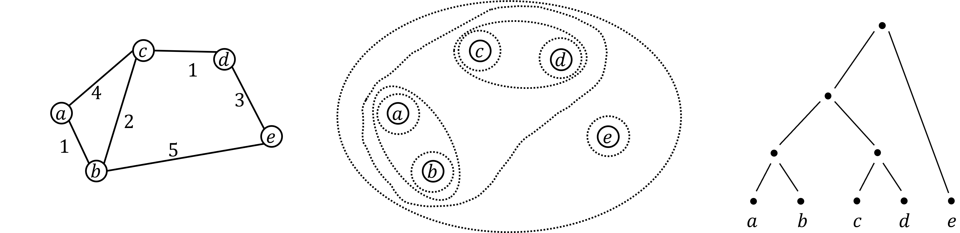 This clustering minimizes the sum of spanning tree weights of the clusters. This motivates us to define the cost \(\mathrm{cost}_k\) of a single linkage \(k\)-clustering by the weight of the corresponding spanning forest. Besides, if we consider single linkage clustering as computing a hierarchy of clusterings, the total cost of the hierarchy is defined as the sum of the individual clusterings. That is, \(\mathrm{cost}(G) = \sum_{k=1}^n \mathrm{cost}_k\).