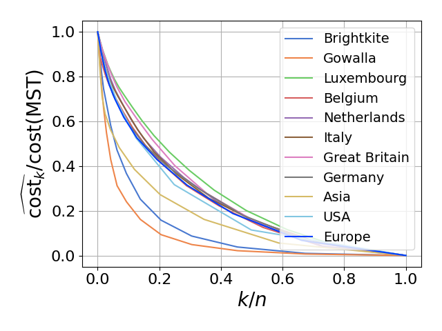 The naive method is to compute a minimum spanning tree first, then compute exact values of \(\mathrm{cost}_k\) and \(\mathrm{cost}(G)\), which is linear in time.