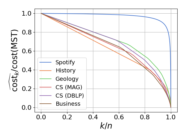 The sequence \(\{\mathrm{cost}_1, \mathrm{cost}_2, \ldots, \mathrm{cost}_n\}\) can be regarded as a profile vector representing the SLC clustering hierarchy. Our experiments demonstrate that these profile vectors can be estimated with high accuracy for each dataset, effectively capturing the intrinsic structural properties of the data.