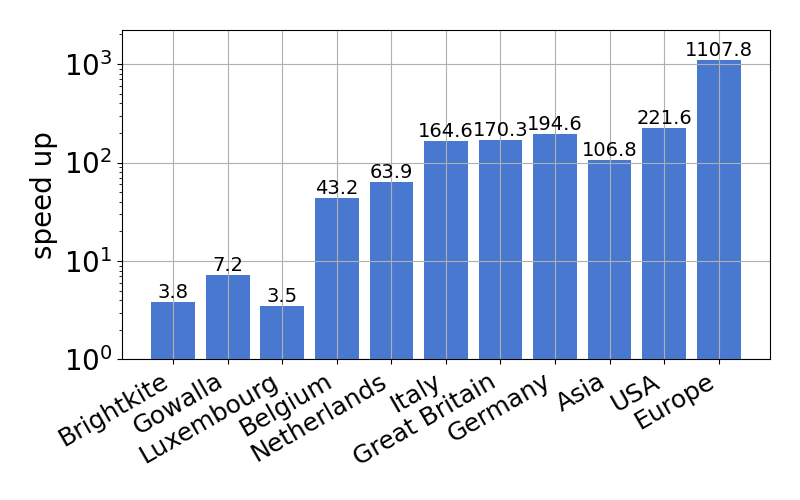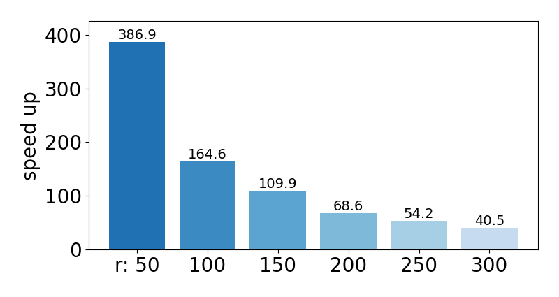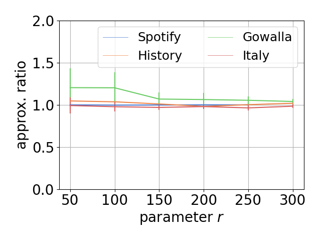 | Approximation ratio | Speed up for datasets (\(r=100\)) | Speed up for various \(r\) |